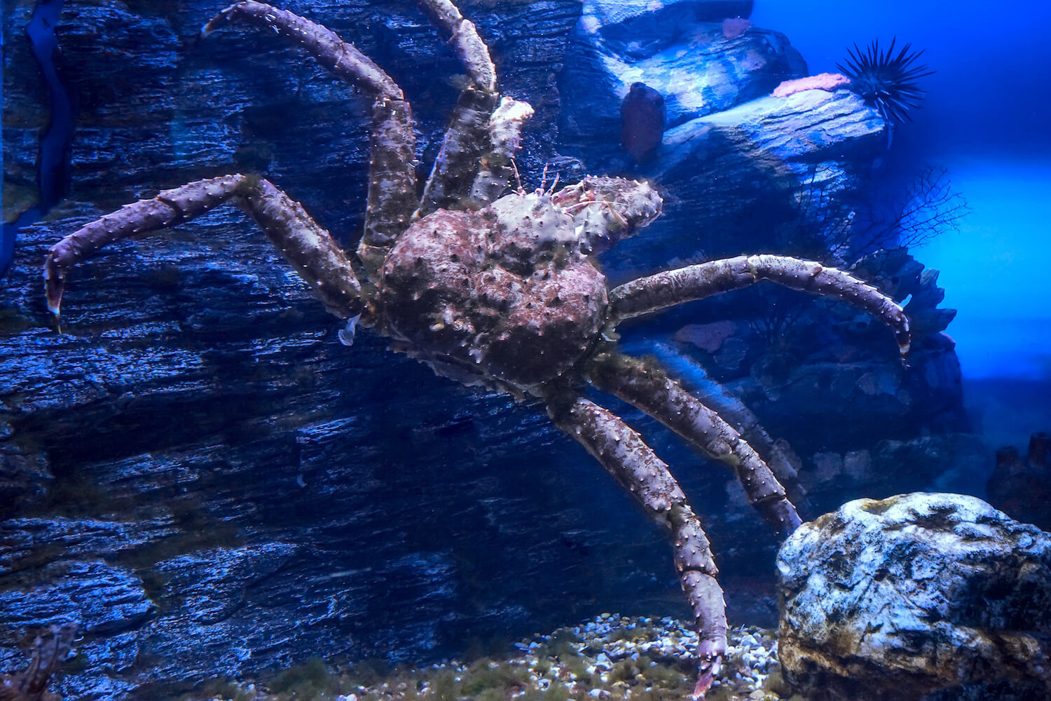 Red king crabs are found in the cold waters of the North Pacific Ocean, primarily around Alaska, Russia's Kamchatka Peninsula, Japan, and the Bering Sea. They prefer coastal waters and are most abundant along the continental shelf. In Alaska, major populations exist around the Aleutian Islands, Bristol Bay, Norton Sound, and the waters near Kodiak Island. Some populations have also been found in Norwegian waters after being introduced there in the 1960s.